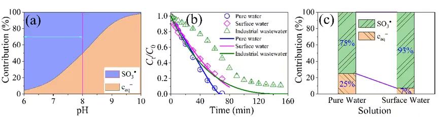 图4. (a)重要自由基作用规律,(b)实际水质中Cr(VI)降解规律,(c)自由基贡献分析