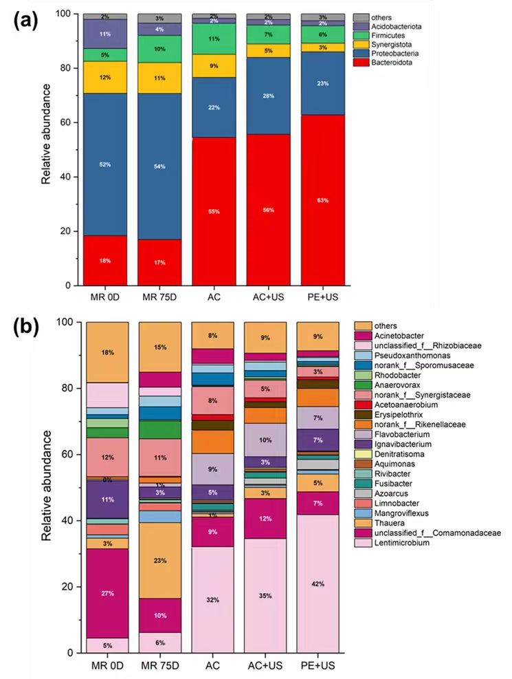 本文以反硝化系统为基础,以缺氧反硝化菌为研究对象,利用低强度超声和惰性颗粒的共同作用,通过低强度超声刺激细胞活性,加快细胞分泌胞外聚合物,促进细胞聚集,用惰性颗粒提供细胞附着位点,从而达到强化絮凝污泥性能,促进颗粒化。微塑料较活性炭更有利于反硝化菌的富集,形成的颗粒中,反硝化菌Lentimicrobium的相对丰度最高。添加了材料的实验组Flavobacterium显著增加,加快了颗粒污泥的形成过程。相关性网络分析结果表明,造粒过程中,优势反硝化菌与其他反硝化菌之间出现了竞争关系。颗粒粒径越大,菌种之间的相关性更高。在活性炭组和微塑料+超声组中,Flavobacterium都表现出与norank_f_Rikenellaceae和Erysipelothrix正相关。低强度超声提高了污泥的反硝化性能,促进了反硝化菌群的富集。惰性颗粒的加入为微生物提供了生存环境,刺激了胞外聚合物的分泌,促进了絮凝污泥造粒过程。在低强度超声与微塑料联合作用下形成的颗粒污泥中反硝化细菌的活性和富集程度最高。