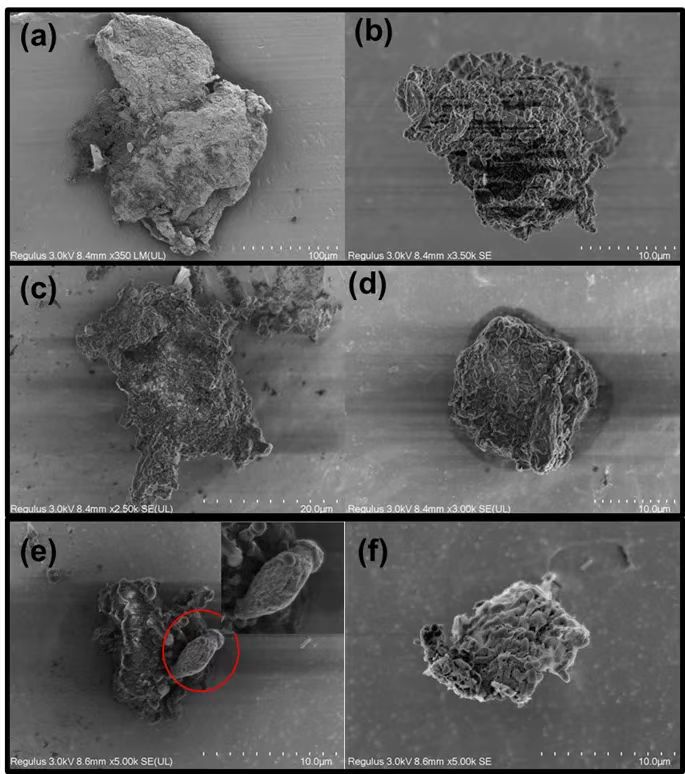 图2 不同组颗粒污泥的扫描电镜图像:a-b:活性炭组;c-d:活性炭+超声组;e-f:微塑料+超声组