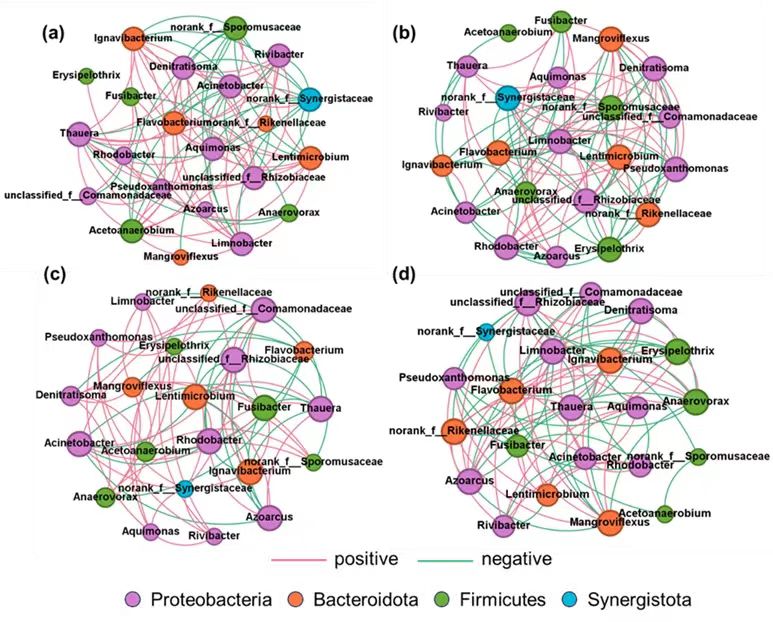 图6 第75天时的菌群相关性网络分析:(a) 母反应器组;(b) 活性炭组;(c) 活性炭加超声组;(d) 微塑料+超声组