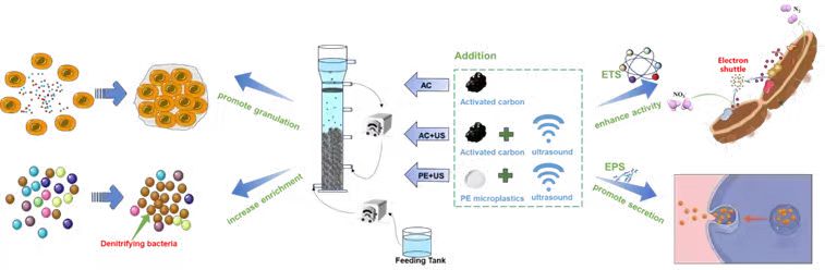 近日,我院楼菊青课题组于2024年11月在国际TOP期刊 Bioresource Technology(IF: 9.7)发表题为“ Low-intensity ultrasound combined with inert particles to improve denitrifying flocculated sludge performance and resulting granulation mechanism”的研究性论文。本研究利用低强度超声与惰性颗粒的联合作用,增强反硝化污泥性能,促进反硝化絮凝污泥造粒。低强度超声的施加提高了污泥的反硝化性能,促进了反硝化菌群的富集。惰性颗粒的加入为微生物提供了生存环境,刺激了胞外聚合物的分泌,促进了絮凝污泥造粒过程。在低强度超声与微塑料联合作用下形成的颗粒污泥中反硝化细菌的活性和富集程度最高。本研究为优化厌氧污泥造粒提供了新的思路。