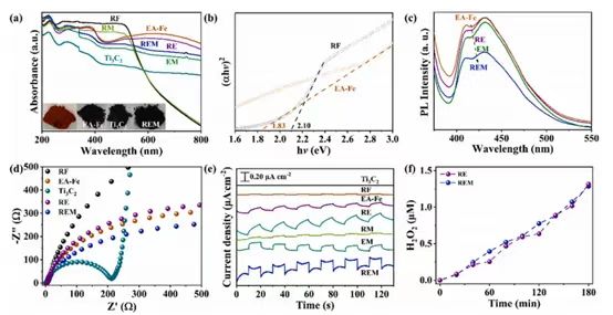 图2 (a)各催化剂的UV-vis漫反射光谱(UV-vis DRS)和(b)各催化剂的(αhv)2与hv的对应图。(c)稳态PL谱图,(d) EIS Nyquist图,(e)不同样品的光电流密度曲线。(f)可见光照射下RE和REM产生的H2O2量。