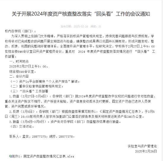 1.自查(2月27日-3月4日):各位老师就2024年度资产核查整改中发现的问题进行针对性自查,重点关注资产账实不相符、资产标签未粘贴、资产信息变动后未及时更新、固定资产仍由已退休人员保管、资产闲置或损坏等情况。