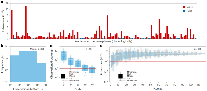 2022年2月24日至2023年5月31日俄乌冲突期间战争引起甲烷排放的第一次调查如图1所示。利用Gaofen-5、Ziyuan-1和Sentinel-2卫星的数千张高光谱和多光谱图像的综合数据集发现基辅、顿涅茨克、卢甘斯克和哈尔科夫等所有前线都发生了广泛的甲烷泄漏事件(图1a)。通过空间分析进一步揭示了乌克兰各地甲烷羽流分布存在显著的城乡差异。尽管城市地区仅占国土面积的6%(图1a),但它们拥有所有检测到的甲烷羽流的75%,而其余的羽流则散布在农村地区(图1b)。这种城乡对比在城市中最为明显,尤其是在马里乌波尔、北韦多涅茨克和布查(图1c)。