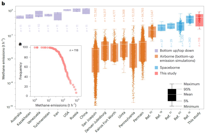 战争引发的甲烷羽流遵循重尾排放量级分布,大多达到全球甲烷超排放体的水平(图4)。俄乌战争期间引发甲烷羽流中位数超过50 t/h,约为美国人为排放量的3%-5%,俄罗斯的2%-6%,澳大利亚的30%-35%。相比之下,石油和天然气田、煤矿和填埋场的甲烷排放强度大约在4×10-4t/h到每小时几百吨之间,大多比战争引起甲烷排放量低几个数量级。全球超级甲烷排放源和北溪管道爆炸的排放量可能低于战争引起的排放量。这些巨大差距凸显了战争在重新定义人为甲烷排放的影响和抵消全球甲烷减排方面所产生的重要负面影响。
