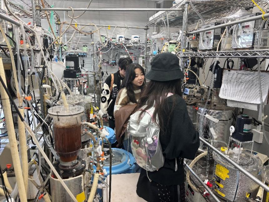 访学团参观了校内实验室。实验室内部布局紧凑有序,配备了多种生物反应器、流量控制设备、传感器以及复杂的管道网络,展现出高度专业化的科研环境。学生们专注于观察实验设备,表现出浓厚的学术兴趣。这种实地学习为学生们提供了理论知识与实践操作相结合的宝贵机会,进一步加深了他们对前沿科学研究的理解。